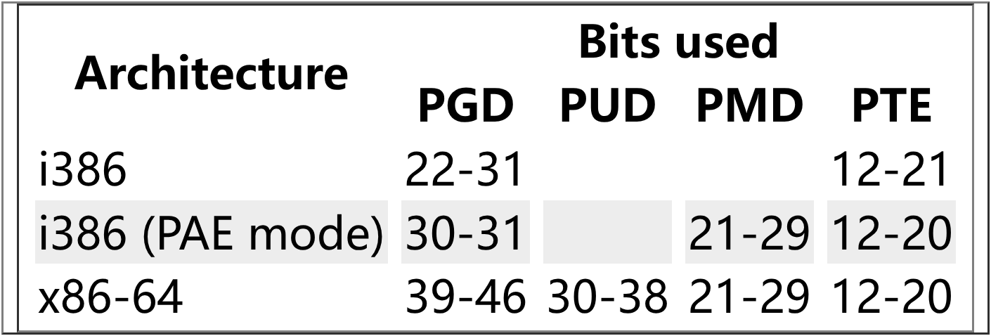 在 i386 模式下默认使用两级页表,PAE 模式下使用三级页表,x86-64 下使用四级页表,一共使用了 46 位。
