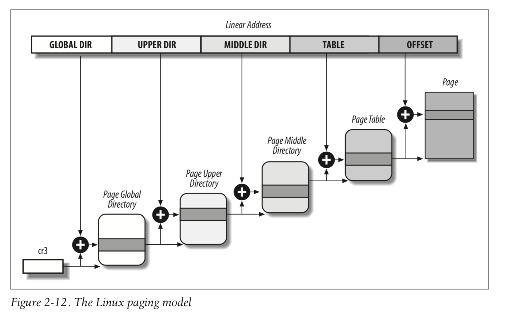 自从 2.6.10 开始,Linux 引入了四级页表,这使得用户可以操作最大 128 TB 的内存。它的寻址模型为: